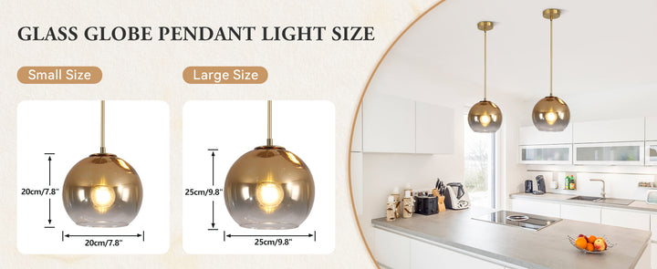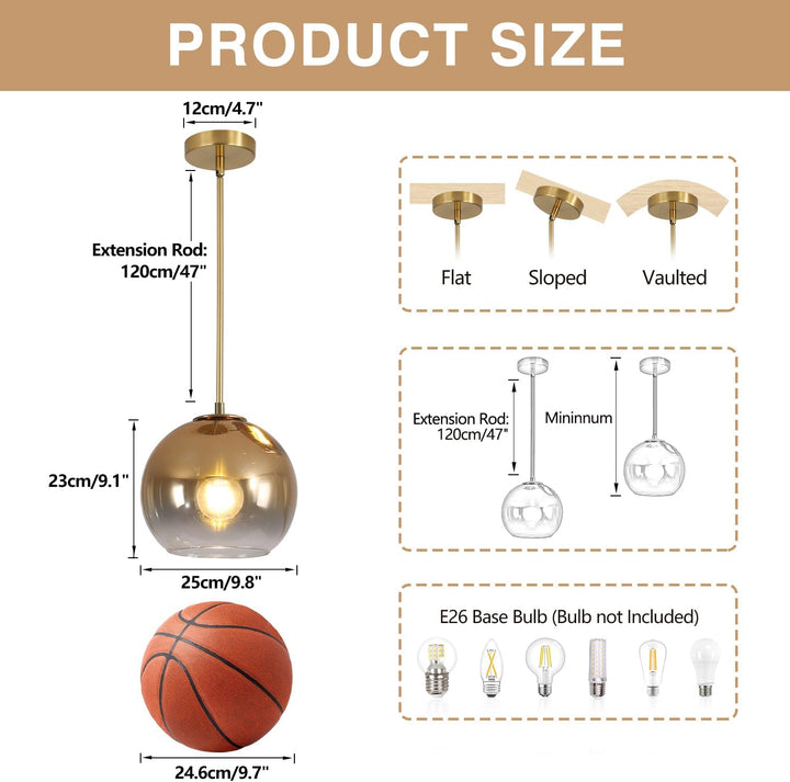 - Glass Globe Pendant Light Size: The modern globe pendant lighting width: 9.8”(25cm), canopy: 4.7”(12cm). Light source: E26 base (Bulb not included), voltage: 110-220V for worldwide. The globe hanging ceiling light fixture can be dimmable when work with dimmable bulb and switch