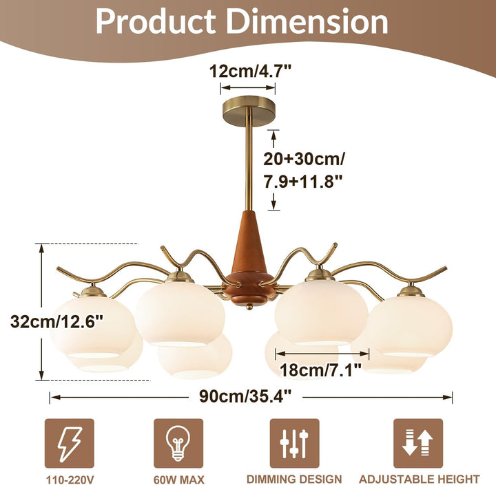• 【Vintage Farmhouse Chandelier Size】Milk Glass Chandelier (Gold): Length: 35.4 inches (90 cm), Height: 12.6 inches (32 cm), Extension Rod: 7.8+11.8 inches, Canopy: 4.7" (12cm). Light source: E26, voltage: 110-220V for worldwide. This retro chandelier does not support dimming on its own, but dimming functionality can be achieved by using dimmable bulbs and a dimmable switch (both not included).