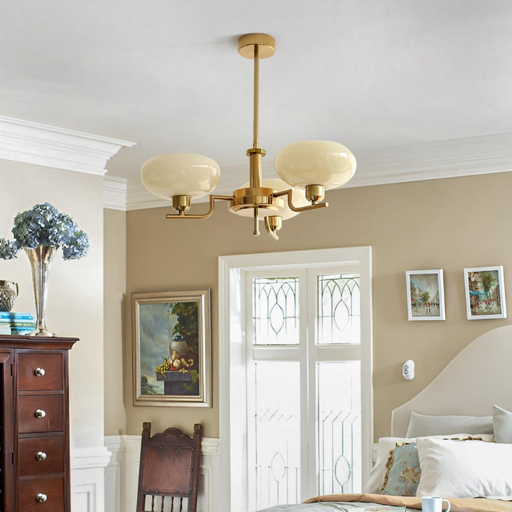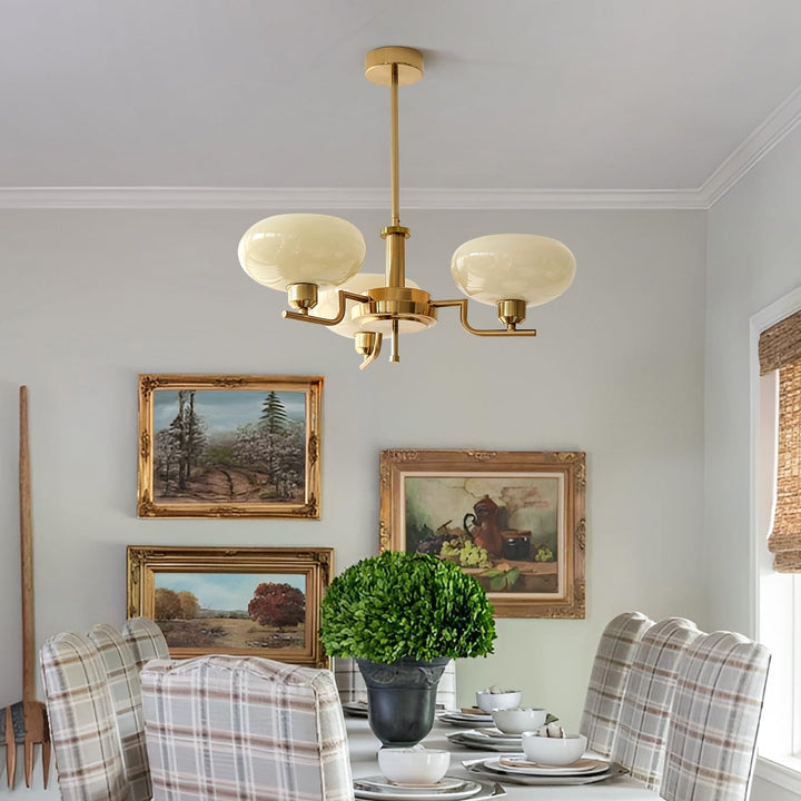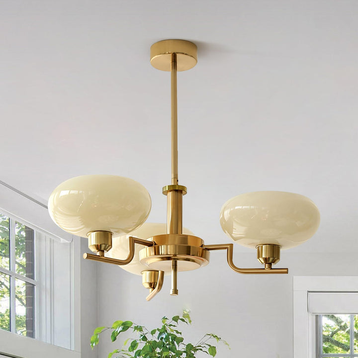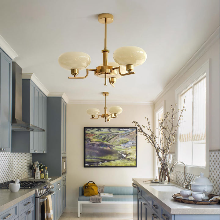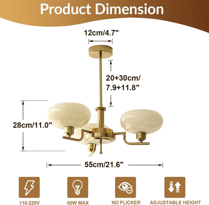 • 【French-style chandelier】Inspired by French Art Deco and retro-futurism, this gold modern chandelier combines 3 cream yellow glass globe with polished brass-tone arms. The warm cream color softens light output, while the geometric metal frame adds industrial elegance—perfect for dining rooms, living rooms, or vintage-inspired kitchens.