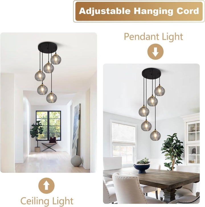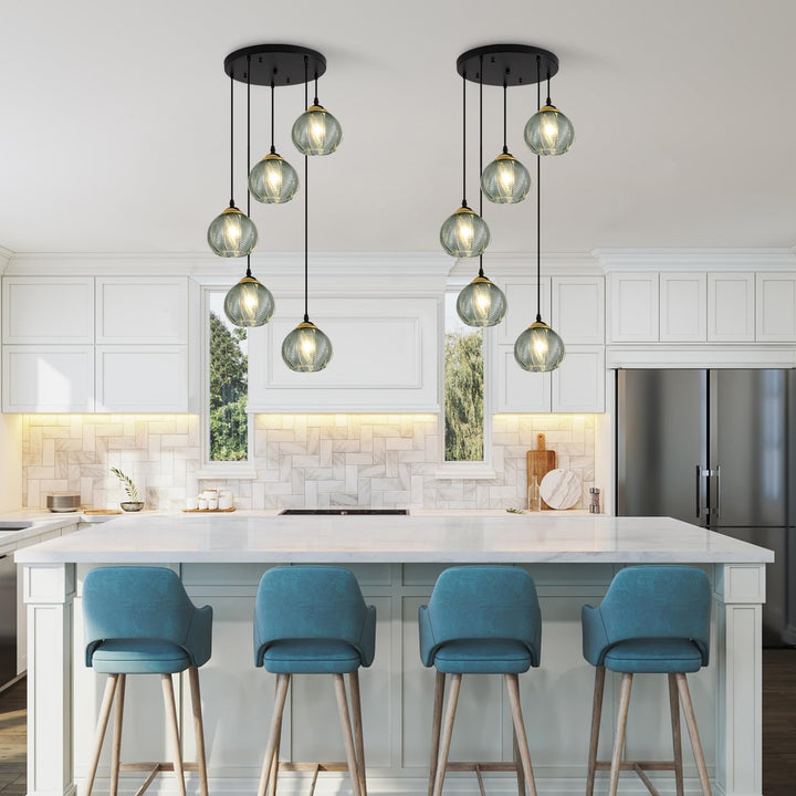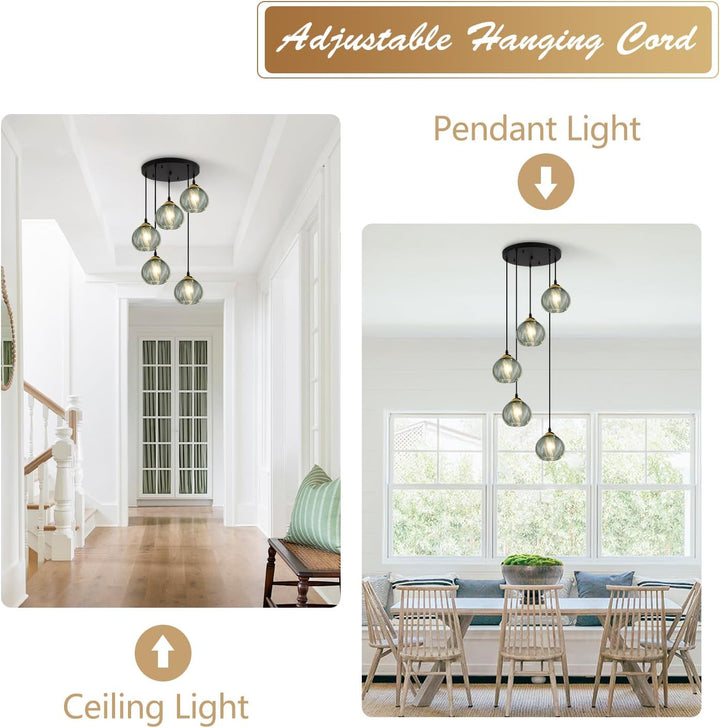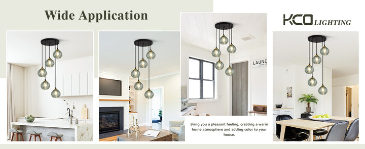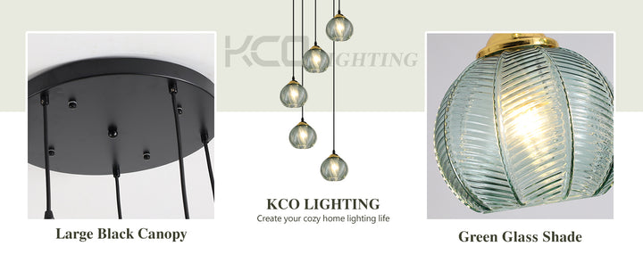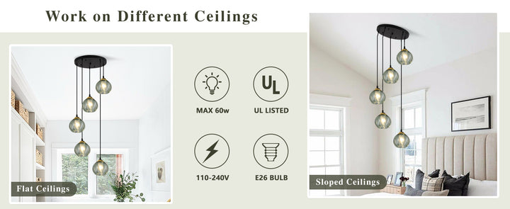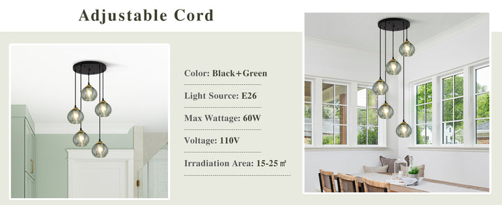 - Adjustable Cord in Length: The black 5 light cluster pendant lighting features five cables that are the same length, 59.1 inches, the black cord matches the black canopy perfectly. You can adjust the hanging height to achieve various arrangement layouts by increasing or decreasing cord length. If you have very high ceilings, we could send you longer hanging cord replacement. The large green glass pendant light can be installed on sloped, vaulted, slanted and flat ceiling