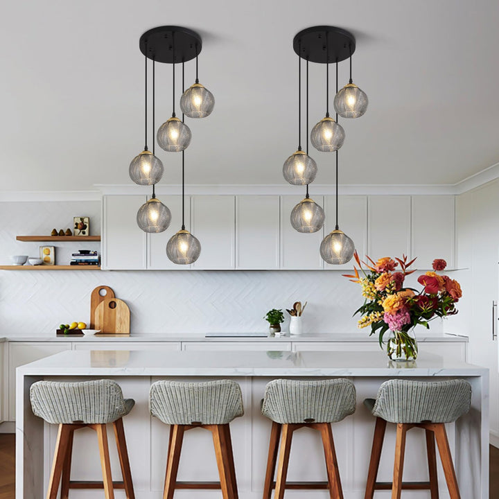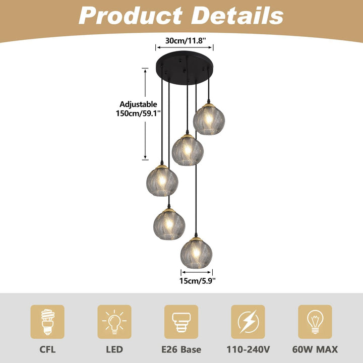 - Black Kitchen Pendant Lighting Size & Bulbs Requirement: The multi pendant light fixture glass shade diameter: 5.9”(15cm), canopy: 11.8”(30cm), hanging cord: 59.1”(150cm). Light source: E26 base, voltage: 110-240V for worldwide. This 5-light cluster pendant lights stairwell lighting itself is not dimmable, but it can be dimmable when work with dimmable bulb and dimmable switch