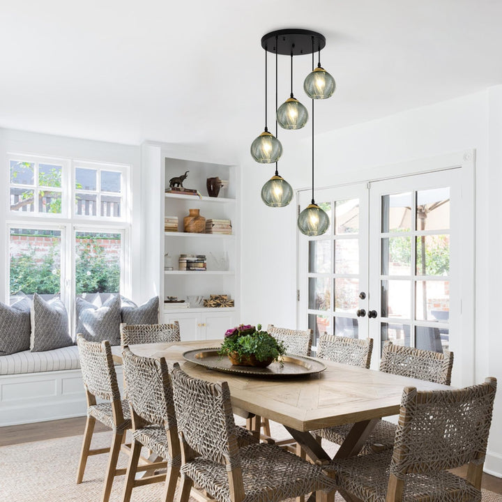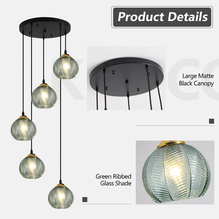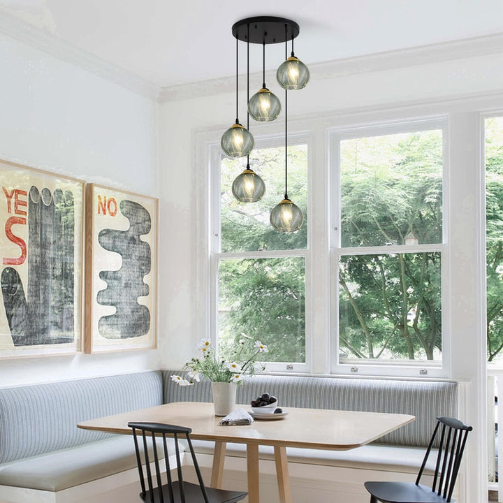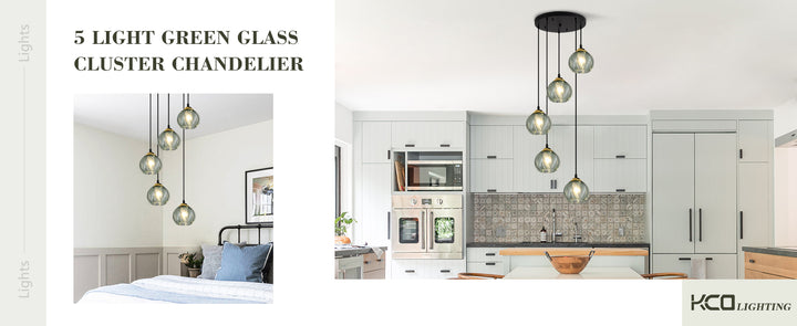 - Distinctive Green Globe Design: The 5-light green glass cluster pendant lighting is made of high-quality metal lamp body and glass shade, the glass shade have a unique green color with leaf vein textured, which would soften the lighting, emit a beautiful retro and warm glow when turn on. When the lighting passes through the glass shade, create a modern and romantic atmosphere and illuminate your home